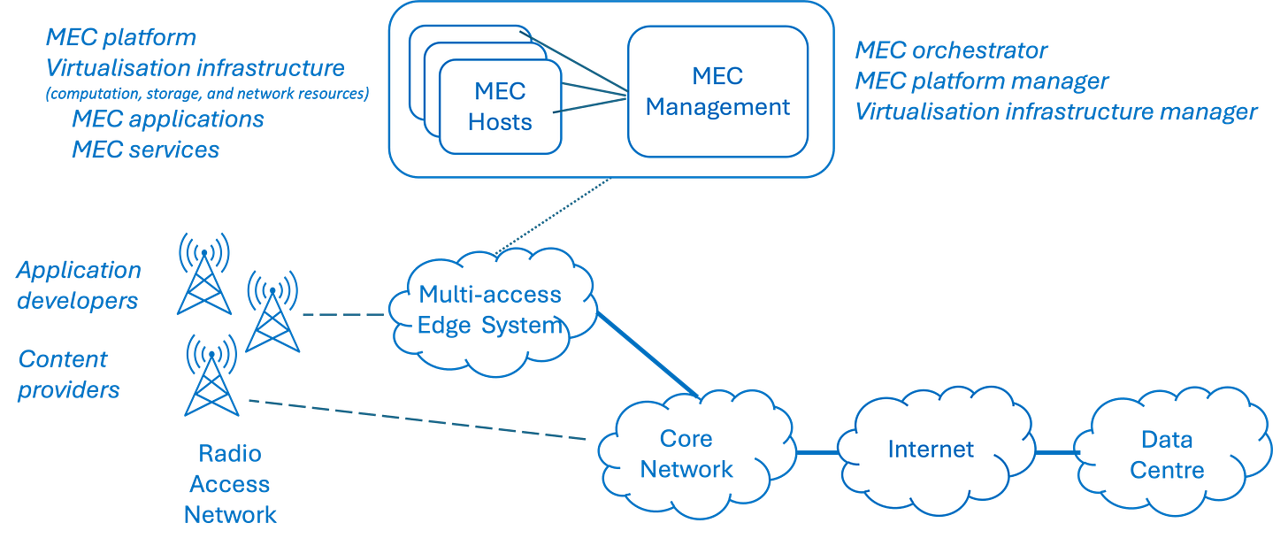• Edge network placement: MEC servers are situated at the network edge, like cellular towers or local data centres, rather than in large, centralised data centres.